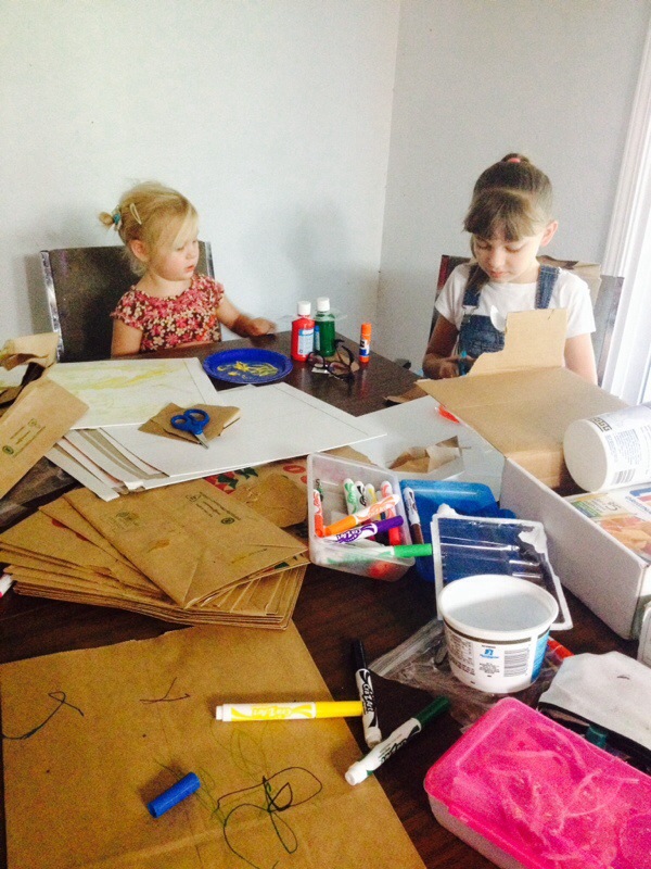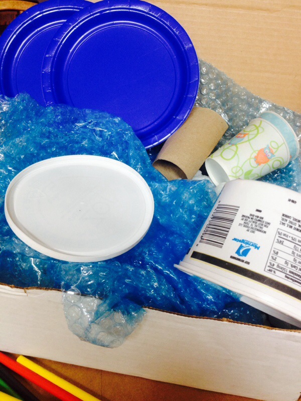 I set the box of odds and ends on the table along with some scissors, glue and markers. It was so much fun to see them riffle through all the “trash treasures” to find just the right items.